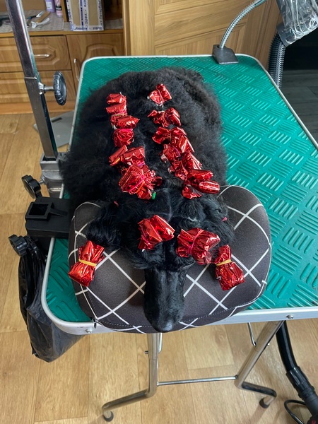 Ну и банный день нынче, долгожданный, это святое, любимое. Еще мне и лапы внизу подстригли и на кончике хвоста шерсть укоротили, такой сразу хорошенький получился. А паппи мама мне опять разноцветные навязала, конфетные. Хотя, все, кто их увидел, сказали, что я новогодняя ёлка. И вот не лень же ей было целый час этим заниматься, подсчету они не подлежат, их там тьма тьмущая. Мне они нравятся, не сдираю, не мешают. Иногда к зеркалу подойду и любуюсь собой.