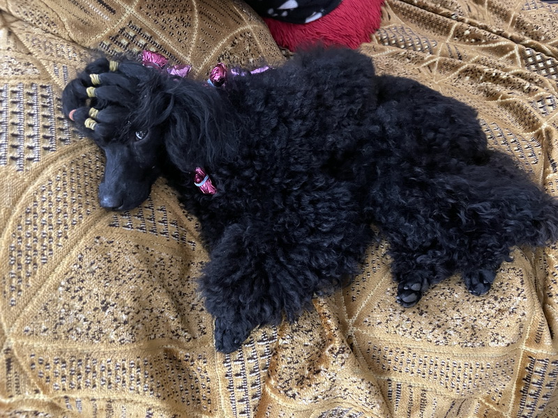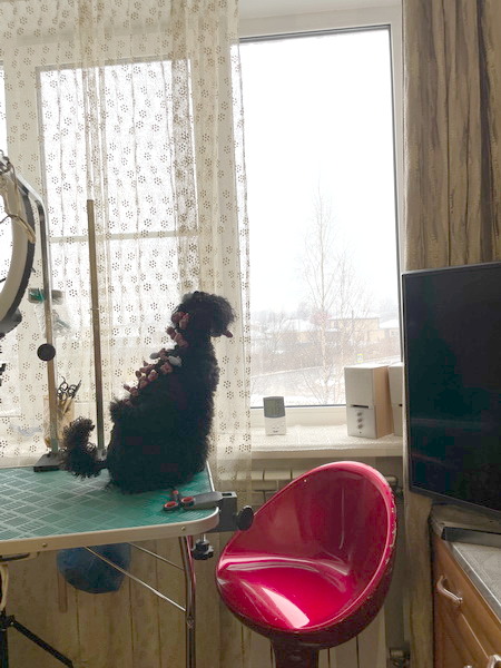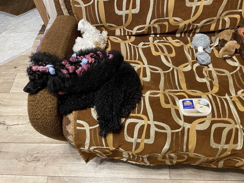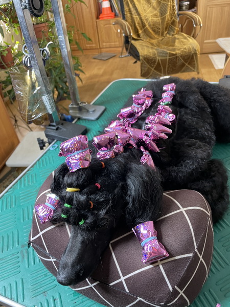Мыли, сушили меня, расчесывали, паппи разноцветные вязали прямо с утра пораньше. Люблю, когда за мной много ухода, поэтому и не сопротивляюсь ничему, всё мне в радость, как и маме тоже, кстати. А побрить морду и лапы мама забыла. Пришлось потом опять ставить на стол и доделывать. Не нравится ей моя мохнатая мордашка.