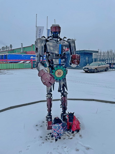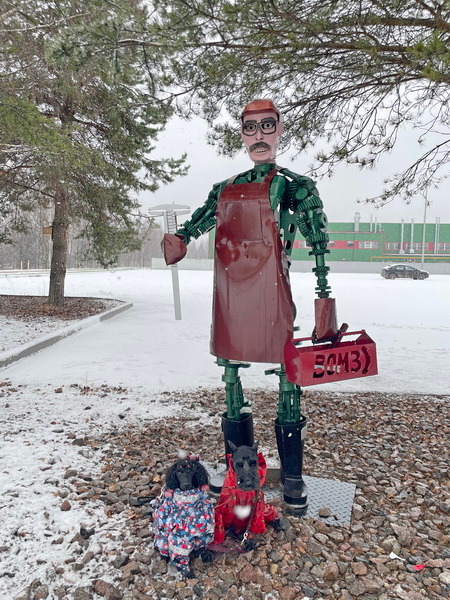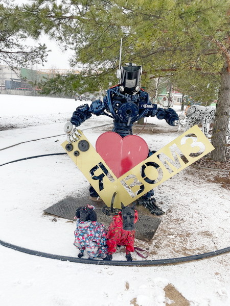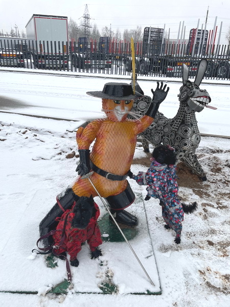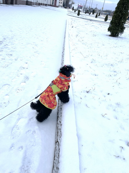 Сегодня зимний день у нас, неожиданный такой. Утром проснулись, а на улице белым-бело и снег идет. Поэтому на дальнюю прогулку мама одела на меня комбинезон, а то бы вернулся весь мокрый и с налипшим снегом. А так сухой и чистенький пришел. Сделали мне несколько зимних фото, да с каменным большим кабаном сняли, пока я его рассматривал. Крутой такой.