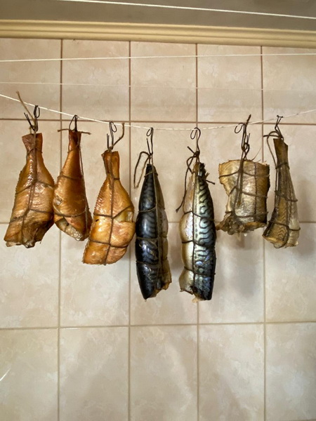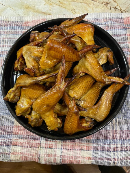 Родители полакомились копчеными куриными крылышками и разной рыбкой горячего копчения, нам ничего не перепало, сказали вредно мол. Ну, как всегда, им полезно и вкусно, а нам нельзя.